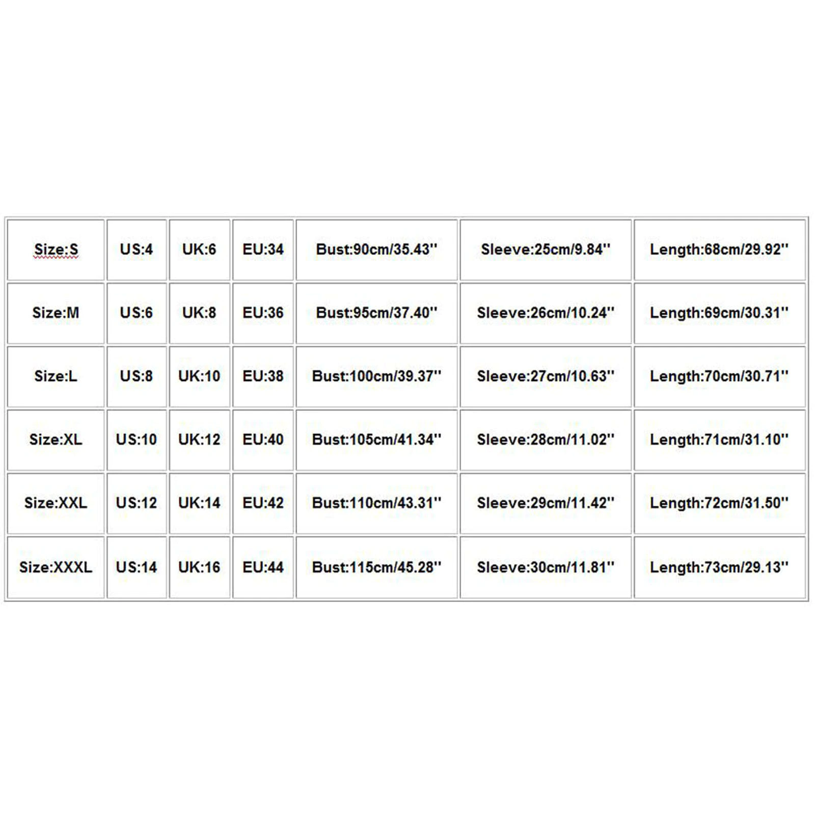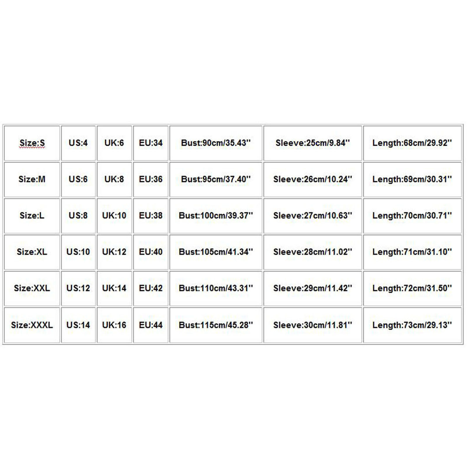Size US UK EU Bust Sleeve Length